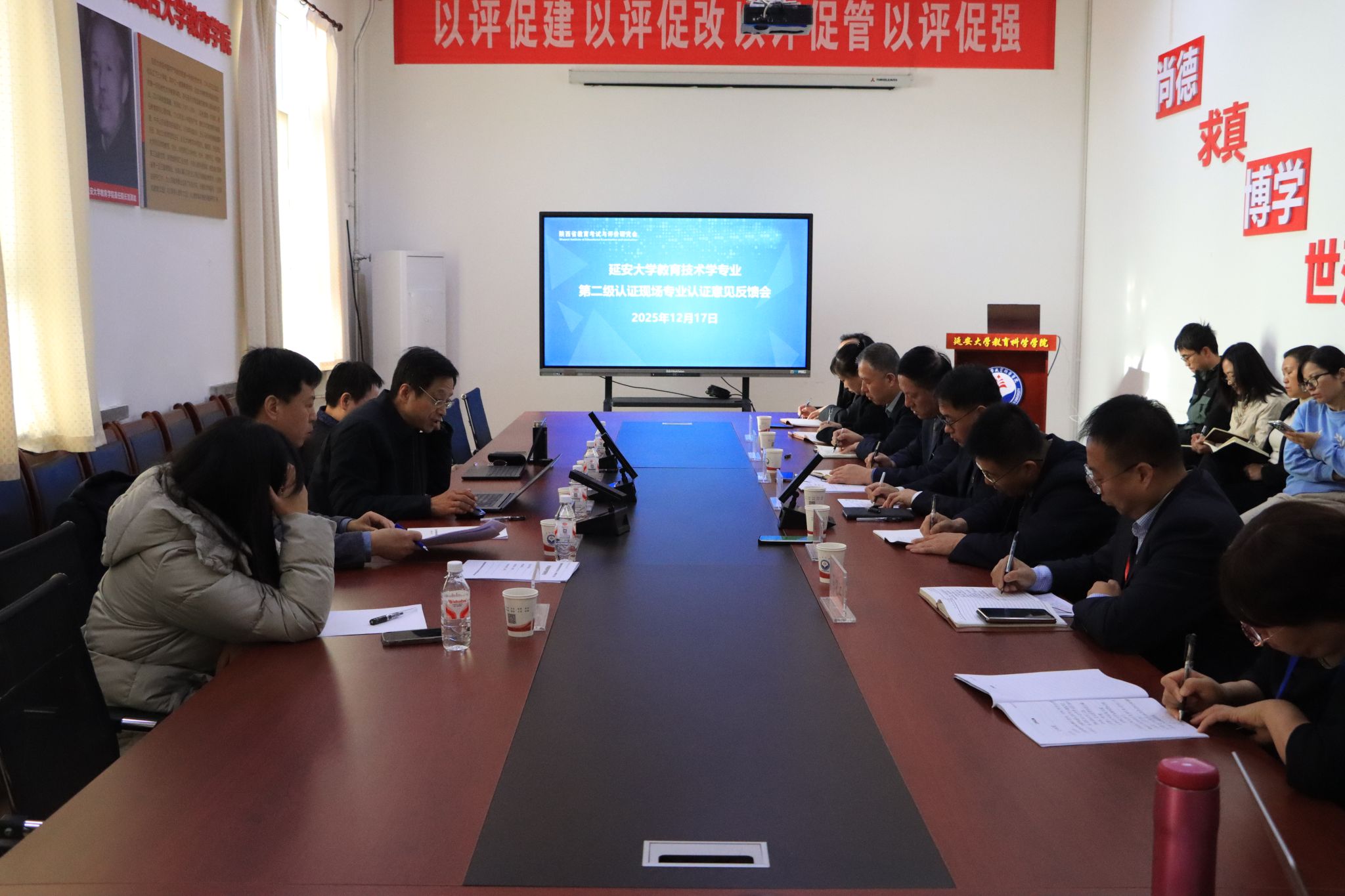 考察期间,刘瑞儒院长代表学院向认证专家汇报了我院历史沿革、现有基础及教育技术学专业的办学历程、专业建设主要特色、取得的主要成效及今后持续改进计划等专业认证材料进行了补充汇报。随后,专家组成员分别深入课堂、实验实训室、校外实习基地等听课访谈,召开了教师座谈会、学生座谈会、管理人员座谈会及实习基地座谈会、毕业校友座谈会、用人单位代表座谈会等就课程设置、教学改革、学习体验、学业支持以及毕业生专业素养、实践能力、创新精神的评价与需求等方面进行了广泛而深入的交流与问题循证,全面了解专业办学情况,期间专家组还调阅了专业人才培养方案、课程大纲、试卷、课程设计报告、毕业论文(设计)、实习实践报告、课程达成度评价报告等大量教学文档与质量评价材料,核查课程教学对毕业要求的支撑情况。对我院教育技术学专业人才培养目标、毕业要求、课程体系、师资队伍、支持条件及质量评价等进行了全方位、深层次的把脉问诊,同时围绕专业的师资队伍建设、教学条件保障、培养过程质量等方面进行了全面深入的综合考查。最后专家组召开了考查意见反馈会,充分肯定了我院教育技术学专业办学成绩亮点,又提出了持续改进的指导意见。刘瑞儒院长最后作了表态发言,各位专家反馈的意见建议站位高客观中肯,把脉准指向明,切中要害,为我院教技专业改革建设发展提供了重要指导。会后将会立刻逐条梳理,制定整改方案,召开整改动员大会,明确目标、细化措施、压实责任,逐项落实,确保立行立改、真改实改、改出成效。我院将以此次专业认证工作为契机,全面落实“学生中心、产出导向、持续改进”的认证理念,将认证标准深度融入人才培养全过程,努力培养具有延安精神特质的政治强、思想正、情怀深、高素质的教育技术人才。