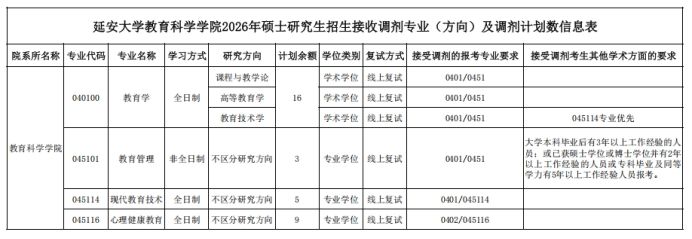 详见延安大学研究生院《延安大学关于2026年硕士研究生招生接收调剂办法的公告》